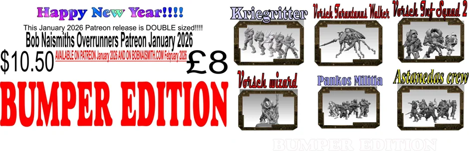 My love, just like yours, is science fiction of all sorts – books, films, figures, kits – you name it! The figures on this website are all my own designs. They are intended for use in the 28-30mm games environment, but they can very easily be printed to suit 15mm just as well. I really hope you like them as much as I have enjoyed making them. With your support I hope to continue making many more. If you haven’t already done so, please look me up on Patreon.com under Bob Naismiths Overrunners.